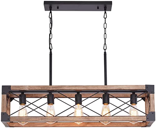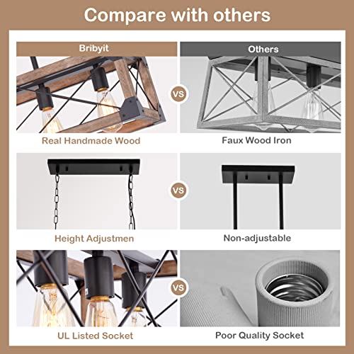 ?[Farmhouse Lighting] Bribyit island lights for kitchen consists of solid wood frame and black metal canopy. The slender black iron grille and 8 iron corner guards highlight the farmhouse industrial style of this dining room light fixture, making it the perfect choice as a kitchen island lighting.