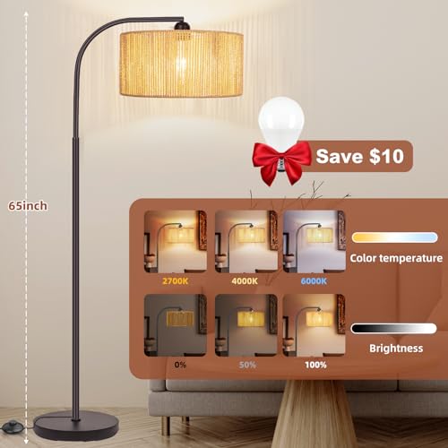 Stepless LED Bulb: Our boho over couch lamp includes an energy-saving 9W LED bulb, equivalent to a 60W incandescent bulb, saving up to 90% on energy costs. Achieve the perfect boho ambiance with our arch floor lamp. Smoothly adjust brightness from 0% to 100% and fine-tune the color temperature to match your mood and preferences