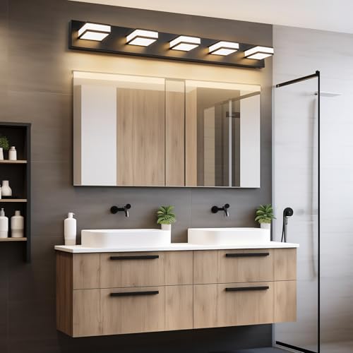 ?????Unique Design?Made of high-quality metal frame and white acrylic lampshade, bathroom light fixtures over mirror is waterproof and dust-resistant, durable and has a long LED life. And unique 5-lights square design makes the bathroom vanity lighting become more elegant and Industrial, creating a comfortable and modern ambiance to your house.