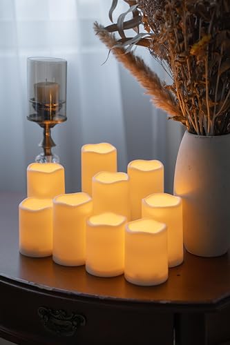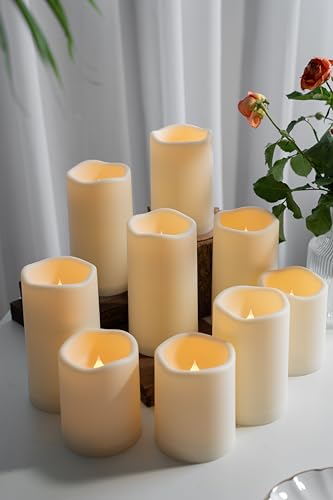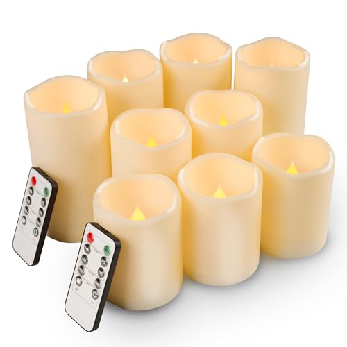 ? Packing List: This battery flameless candles sets includes 9 battery operated candles flickering (H 4" 5" 6" x D 3"),With 2 10-key remote control, and a user manual. The battery operated candles need 2 AA batteries(NOT included) with a life of more than 500 hours.