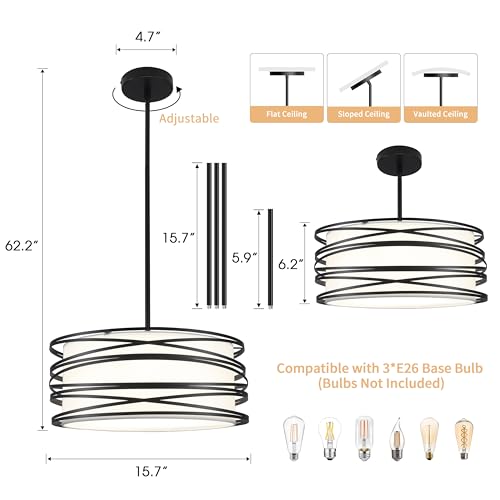 ?Height Adjustable?The black chandelier light fixture lamp shade 15.74"W*6.3H". The dining room lights over table is designed with a splicing bar to provide stability and reduce any wobble compared to chain. There are a total of 5 splicing rods that can adjust the height of the kitchen table light fixture from 62.2 inches (MAX) to fit a variety of spaces and meet any lighting needs. Moreover, the light fixtures for dining room ceiling can be installed on sloped, flat and vaulted ceilings.