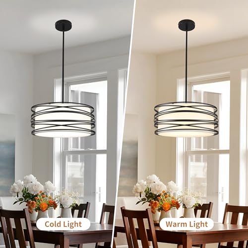 ?3-Lights Drum Pendant Light?The classic combination of black staggered spiral line cage with white fabric shade, the stylish retro double-layer drum frame design, and the hollow design of the lampshade enables this drum chandelier to emit a 360°beautiful light shadow. The simple and casual gives you a retro elegant touch and a simple modern aesthetic makes this chandelier exude a unique charm.