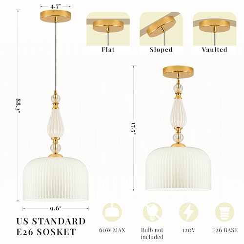?Milk Glass Pendant LIght?The unique design of this pendant light features a milky white glass lampshade with bright golden metal parts and ceramic glass beads. Vintage milk glass pendant light seamlessly blends vintage aesthetics with modern functionality. The cream-styled milk glass lampshade presents a soft and cozy light. This pendant lamp can illuminate and decorate perfectly for your kitchen islands, dining tables, living rooms, and bedrooms. TIPS: Due to display differences, slight color variations may occur.