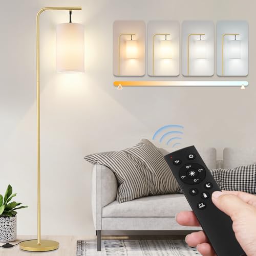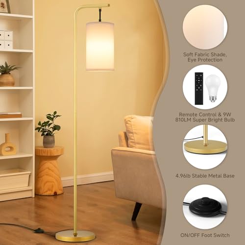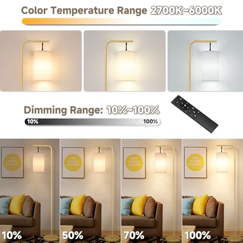 Coucrek Floor Lamp for Living Room, 9W LED Bulb, Remote Custom Color Temperature & Brightness, Standing Lamps for Bedroom Office, Gold