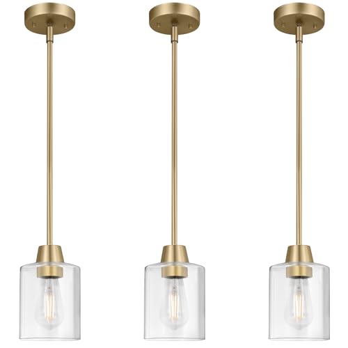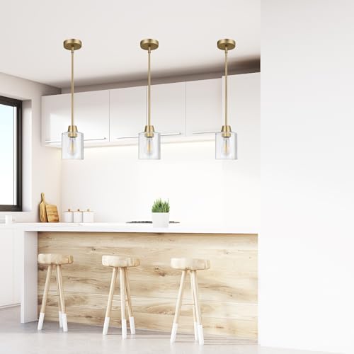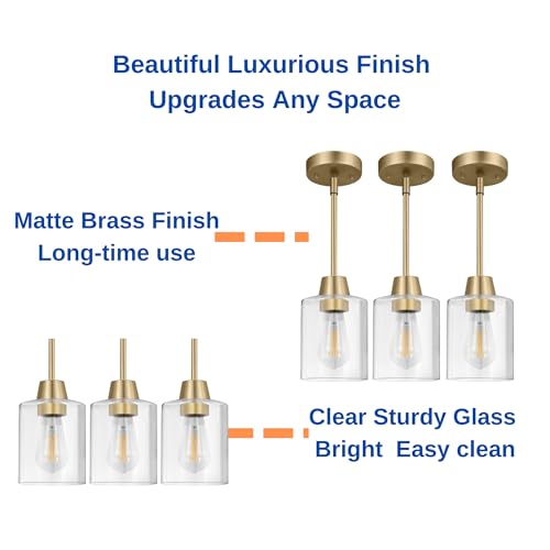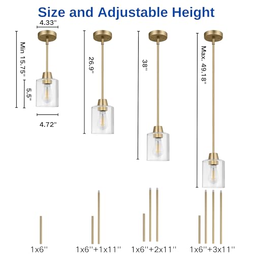 Adjustable Hanging Height and Luxurious Finish: The 3 pack glass pendant lights design with 3pcs 11 inches and 1pcs 6 inches tube suit your any ceiling height,matte brass glod durable finish is made from high-quality metal no fading best for your kitchen pendant lighting over island is perfect for modern and transitional designs