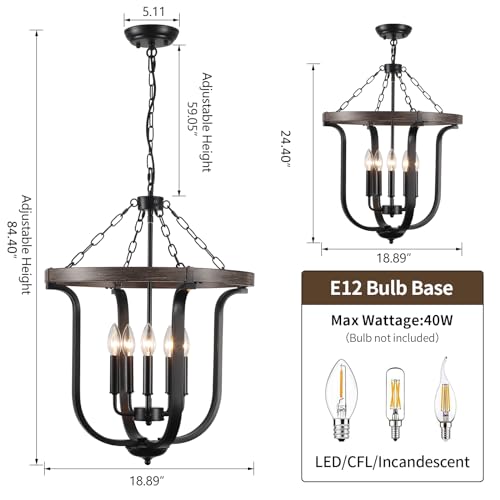 ?Lantern Pendant Lighting Dimension?This farmhouse chandelier H24.4"W18.89" Adjustable Cord Length: 59" Bulb: E12*5 Lamp, Compatible with Incandescent, LED, CFL and Halogen (bulb not included) for use with dimmable bulbs and compatible dimmer switches fully dimmable.