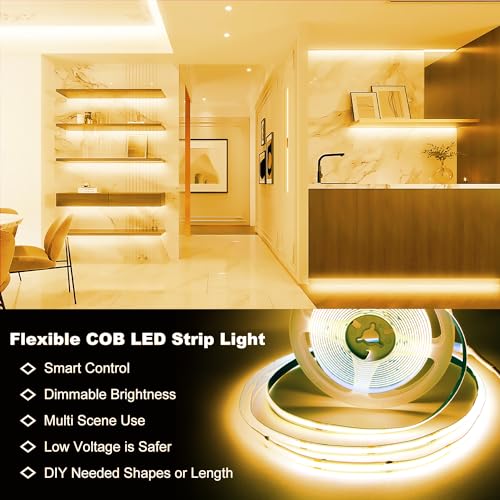 Uniform Light and Cuttable: COB LED Strip Light uses newest form of LED technology, the LEDs are small and densely spaced, provide a uniform glow without gaps or dark spots in the LED Light Strip. The COB Light Strip can be cut to fit the space.