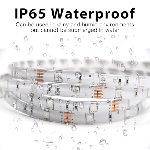 IP65 waterproof: Covered with transparent silicone coating, this LED Strip Lights is dust-tight and rainproof but cannot be soaked in water for a long time, and the color is more crystal clear. (Only the LED strip is waterproof, the control box and power supply are non-waterproof)