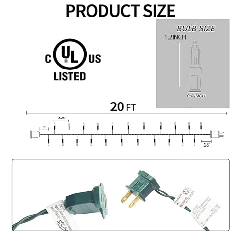 Lights Size: The Christmas mini string lights includes 100 count incandescent light bulbs, the total length is 20 ft, the length of string light is 18.5 ft, lead wire is 1.5 ft, spacing between each light is 2.25 inches. The string light built-in 3A fuse and it is 120V high voltage with UL Certificated for safety, ensure the safety of you and your family. Package Includes: 1 x 20 ft light string, 1 x spare fuse, 4 x additional incandescent bulbs.