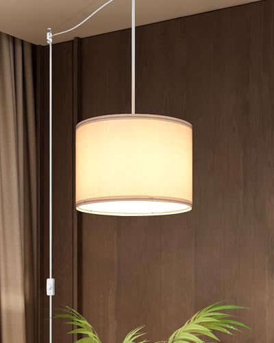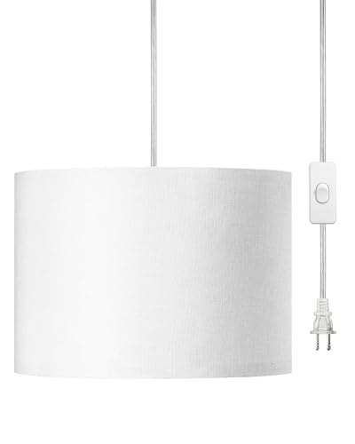[Simple & Modern] Featuring a white linen shade, this hanging light fixture adds texture and warmth, creating a cozy ambiance in any room; the clean fabric shade diffuses soft and inviting lighting, while the classic look adds a touch of elegance to your home; enhance your living space with our plug-in pendant light