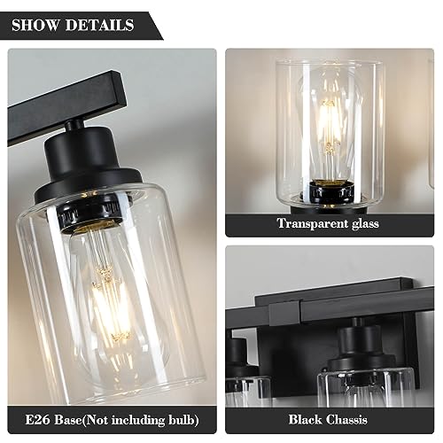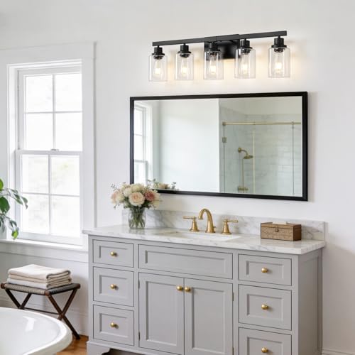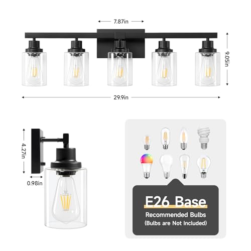 Sturdy Metal Construction: 5-Light Black Bathroom Vanity Light is made of sturdy metal in a matte black finish which no need to worry about getting oxidation and color fading. Additionally, High quality clear glass shades well protects the bulb and maximizes its light, and increases the classic ambiance in any space. Bathroom vanity light perfectly fit with any style. It will bring more exquisite and luxury to your home lighting. It is also the perfect choice for your home lighting