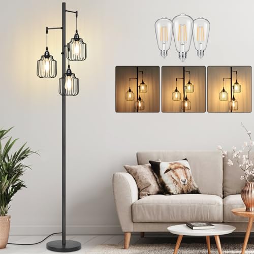 ?3 x 800 lumens LED Bulbs Included?It comes with 3 ST64 LED Edison light bulbs so the tall floor lamp is ready to go and illuminate your space after 5-minute assembling. Each LED bulb takes only 6W energy to offer you superb brightness equivalent to 60W incandescent bulb. It emits 2700K warm white glow that matches well with the black floor lamp. Also there is no need for frequent bulb replacement for LED is known for its long-lasting feature