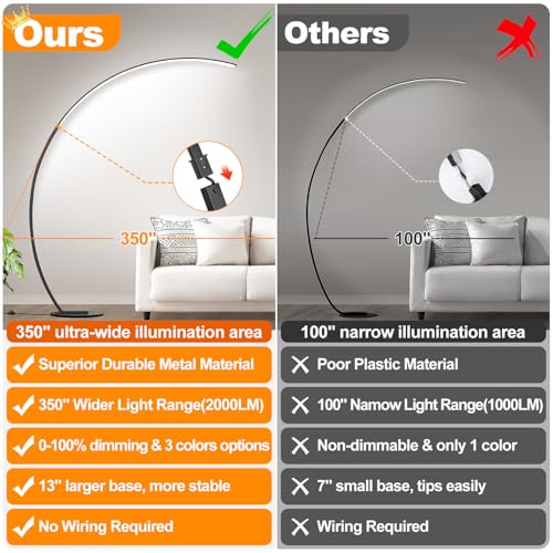 Modern & Elegant Design: With the modern minimalist design concept, our unique arc floor lamp features smooth and simple curved lines. Our dimmable floor lamp does not take up space and can be placed anywhere, making it your ideal home decoration. It can easily match various styles of living room, bedroom, office, kids room, and game room. Additionally, its weighted metal base and sturdy design ensure that it will not be tipped over by children or pets