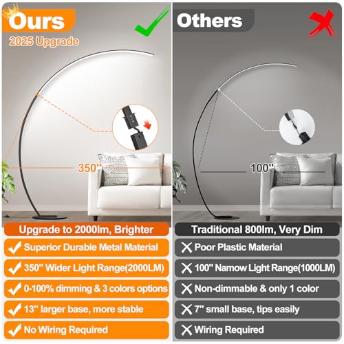 Ultra-Bright Lighting: Unlike traditional floor lamps that are often too dim, our LED arc floor lamp delivers up to 2000 lumens of bright, flicker-free light—perfect for reading, working, or lighting up any corner of your living room or bedroom. This 20W LED arc floor lamp (100W equivalent) features a long-lasting 50,000-hour lifespan, so you don't need to bother to replace any bulbs—offering reliable brightness and everyday convenience.