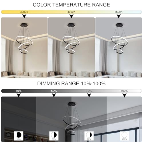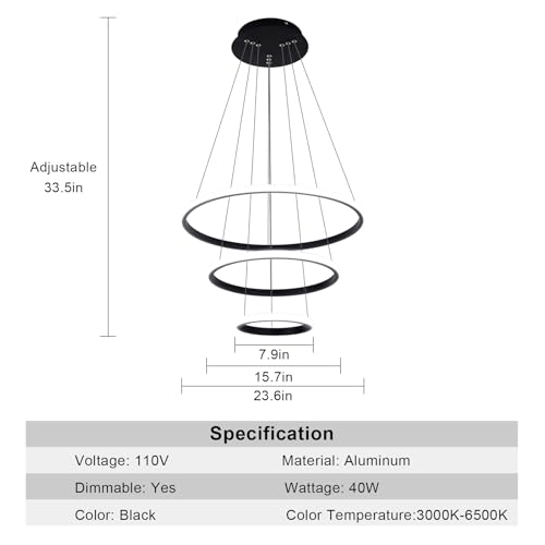 Sleek Minimalist Design: The 3-rings Modern LED Chandelier is made of premium aluminum, metal, and acrylic; Ring diameter: 23.6"+15.7"+7.8", heigh: max 33.5 inch adjustable Ceiling Hanging Light and strip to get different shape