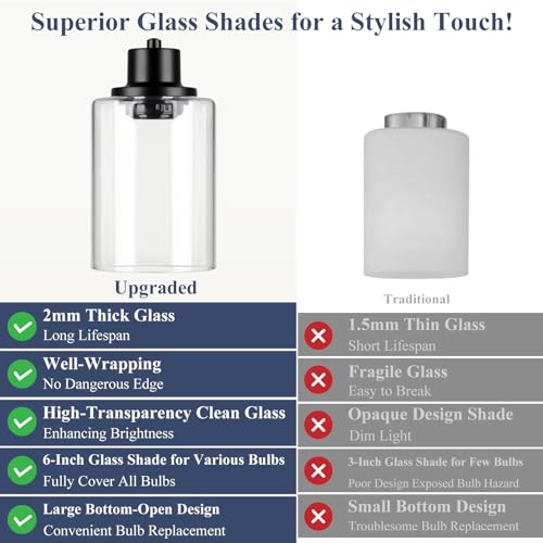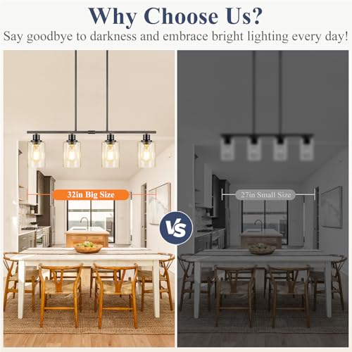 Welcome Home, Stylish Farmhouse Lighting: Elevate your home with this dining room light fixture that blends cozy comfort and modern sophistication. Perfect for kitchens, dining rooms, or entryways, its classic shape and sleek matte black finish effortlessly complement any decor. Furthermore, unlike opaque options, our high-transparency glass and 4-light design ensure every corner is brightly illuminated, casting a bright, soft, and comfortable ambiance to create a warm and inviting experience.