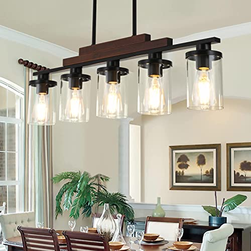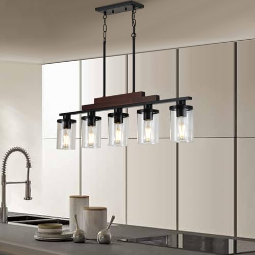 ?Features?This rustic kitchen lights is specially designed for kitchen island and dining table, the perfect combination of vintage solid wood, rust-proof matte black metal and cylinder glass lampshade, simple yet refined, steady and elegant. The 5 light sources become bright, soft and comfortable under the reflection of the clear explosion-proof glass, presenting a warm dining atmosphere.