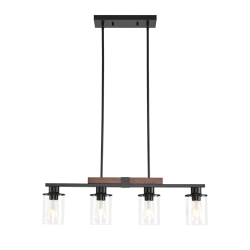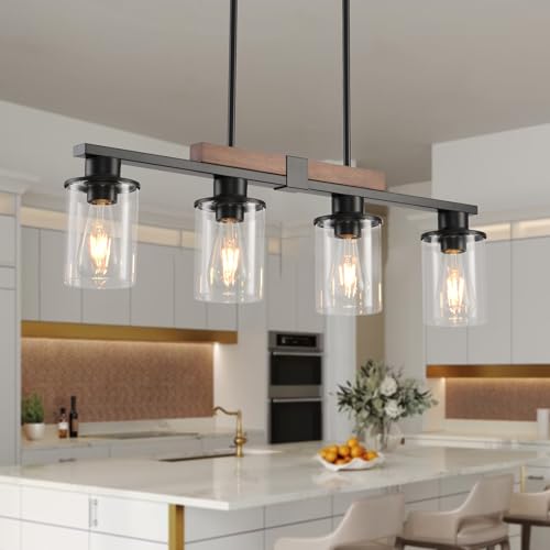 ?Wood Island Lights For Dining Room? island lights for kitchen featured with high-quality natural wood&black metal, adds endless farmhouse chic over your dining tables or kitchen islands, he 4 light sources become bright, soft and comfortable under the reflection of the clear explosion-proof glass, presenting a warm dining atmosphere