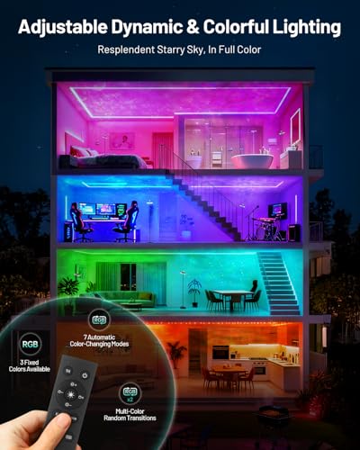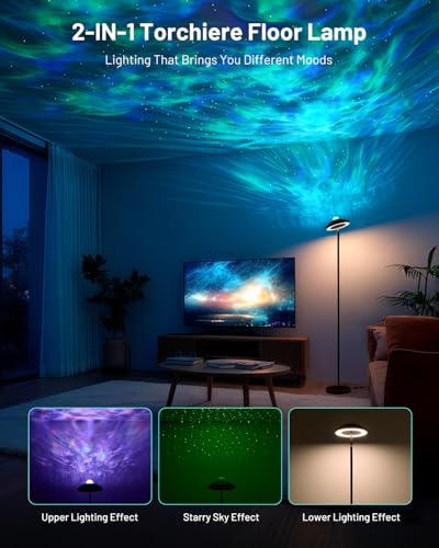 2-in-1 Torchiere Floor Lamp: The Dinoho tall lamp features an innovative design — the lower part is an LED floor lamp for ambient lighting, while the upper part is an RGB star light projector with selectable colors. It allows you and your kids to enjoy flowing auroras and starry skies without leaving home, lighting up romantic nights.