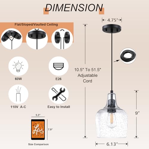 3.Adjustable Design: This pendant light uses Cord (adjustable height 51.5 inches), and there are adjustment tools in the box for easy adjustment, allowing customization to suit your ceiling height.Can be installed on any ceiling.