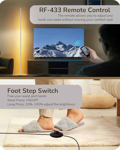 [Remote Control & Foot Switch] Effortlessly adjust brightness and power with the RF-433 remote, offering a reliable range of up to 49 feet; with just one click, you can switch to the night light mode, which is 30% brightness of normal; plus a convenient foot switch for the floor lamp with remote