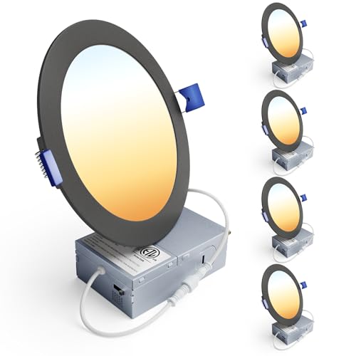 Ensenior 4 Pack 6 Inch LED Recessed Light, Dimmable, 2700K-5000K 5CCT, 1200LM High Brightness, 12W 120V, Damp Rated, Ultra-Thin Canless Wafer Light, Black - ETL & FCC & IC