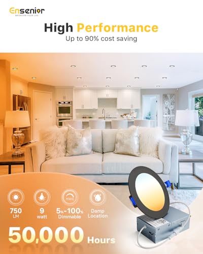 HIGH BRIGHTNESS - Ensenior 4 inch recessed lighting enjoy up to 90% energy savings without compromising on brightness. The enhanced LED chip emits 750LM and consumes only 9 Watts. 5%-100% smooth dimming, compatible with most dimmers.