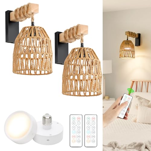 ?Boho Battery Operated Wall Sconces?Bohemian-style rattan wall sconces set of two battery operated, with twine-wrapped solid wood poles, are full of natural charm. The wall sconces battery operated add a beach atmosphere to the bedroom, living room, and entryway, as if resting in the seaside condominiums or the countryside cottage.