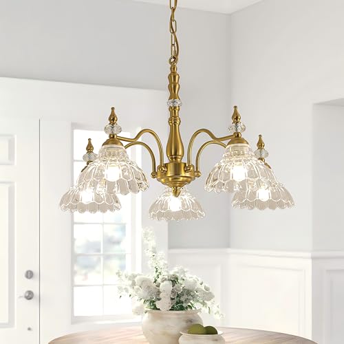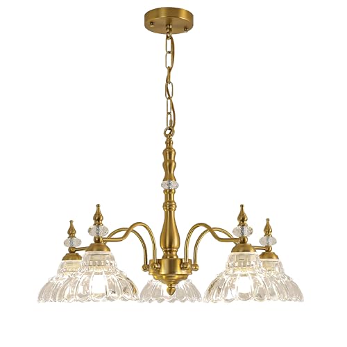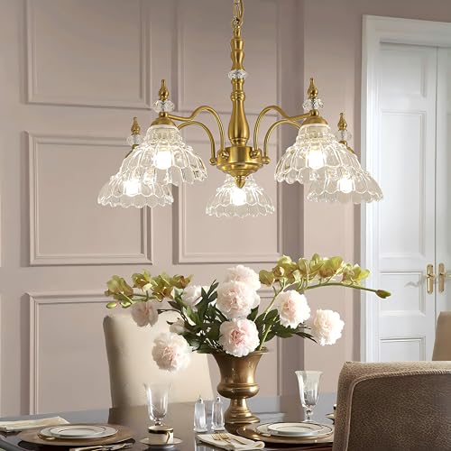 Vintage Design: This 5-light chandelier is made from metal with a brass finish for plenty of glam style. Beautiful crystal beads decoration and Exquisite clear glass shade with flower-shaped. When light passes through shade, it will reflect a warm and beautiful lighting effect.