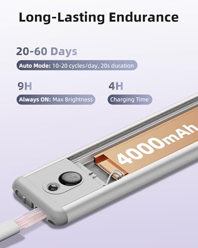 ?USB Rechargeable & Energy Saving?Built-in 4000mAh battery, these under cabinet lighting can be easily charged via the USB cable(included). After fully charged, the wireless under cabinet lighting can last up to 13-15 hours with 100% brightness in Always-On mode. In AUTO mode can last for 30-90 days with an illumination frequency of 10-20 times daily for 20s each. Tips: Please CHARGE before first use.