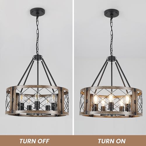 ?Rustic & Farmhouse Chandelier?The brown oak finished frame and black grid match well to show the beauty of the country farmhouse and modern home, classic and durable. The farmhouse chandelier uses a drum-shaped round wooden frame with a black iron fence, which can emit a lot of light and add a rustic beauty to your space.