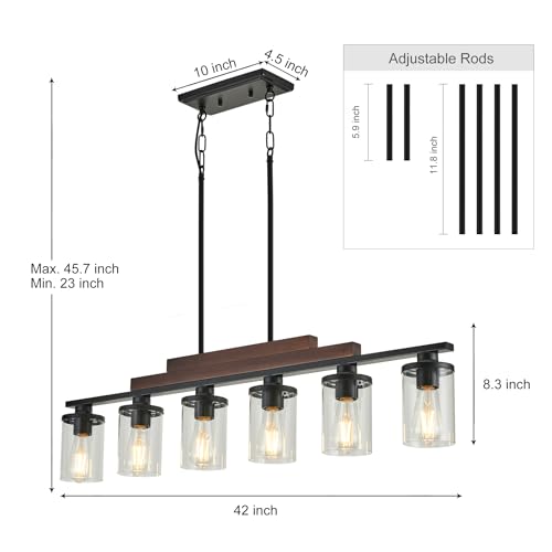 ?Features?This rustic kitchen lights is specially designed for kitchen island and dining table, the perfect combination of vintage solid wood, rust-proof matte black metal and cylinder glass lampshade, simple yet refined, steady and elegant. The 6 light sources become bright, soft and comfortable under the reflection of the clear explosion-proof glass, presenting a warm dining atmosphere.
