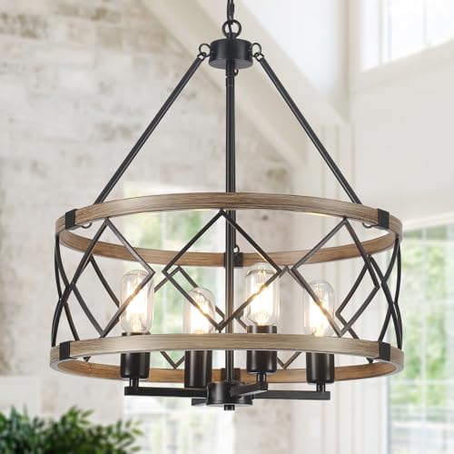 Design concept: The rustic chandeliers with imitation wood veneer frame and black metal grid, pendant chandelier collocation, is the perfect combination of rural retro and modern home, high quality metal, high temperature rust treatment, stable structure, durable, emitting a lot of light at the same time to add a rustic beauty to your space.
