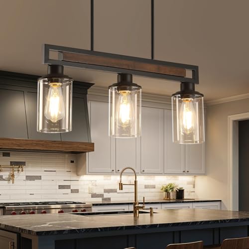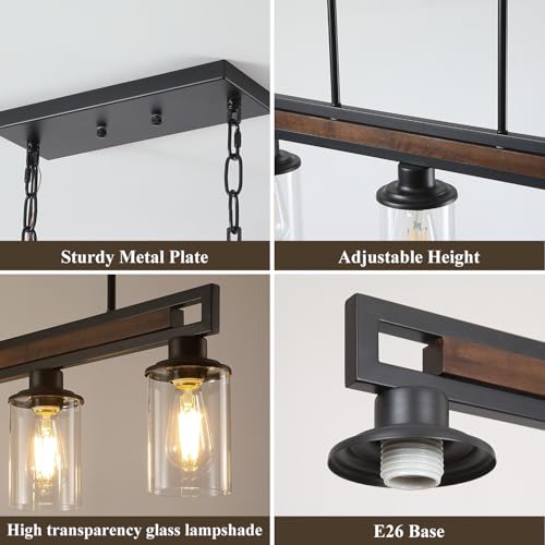 ?Industrial Kitchen Island Lights?Selected high-quality wood, with matte black iron bracket and clear glass shade, recreating the beauty of a classic farmhouse island light. This 5-light island chandelier not only meets the bright needs of kitchen island table for meal preparation, but also creates a soft light dinner scene for the dining table, this farmhouse chandelier is both practical and decorative