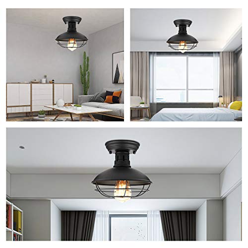 ? METAL CAGE DESIGN: This black flush mount ceiling light features a unique matte black finish and metal cage shade, adds farmhouse vintage charm for your home and cast a warm and cozy ambience.