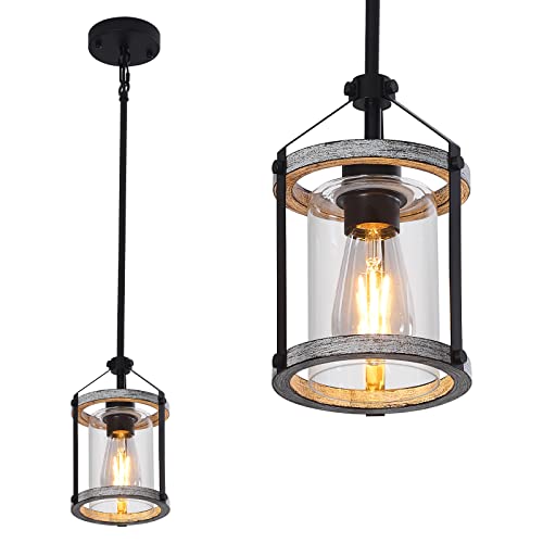 ??Wood and Metal Pendant Light?This industrial pendant light features a rustic white wood finish and a clear glass shade with a matte black frame for a modern, stylish look and will be the perfect statement piece for your dining room or kitchen island .