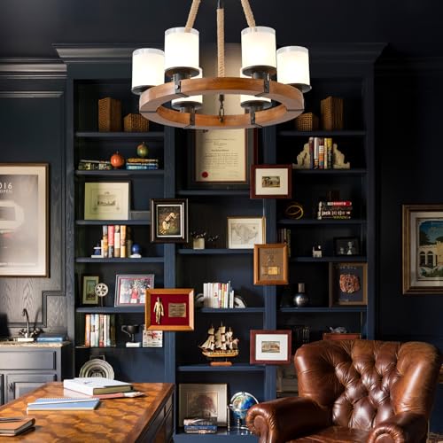 ?Rustic Farmhouse Chandelier Design?This 6-light farmhouse chandelier features a 26.1-inch wagon wheel design crafted from wood, hemp rope, and seeded glass shades. Its rustic charm makes it the perfect chandelier for dining rooms, kitchen islands, foyers, and entryways, combining elegance and practicality.