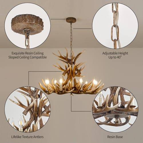 CHANDELIER PARAMETERS: This deer antler chandeliers includes 9 arms with lampholders + 6 arms without lampholders, Diameter: 35“, Height: 24.5” with adjustable chain length of 39.4”, easily matches with different heights of ceilings and works with sloped and vaulted ceilings. Utilizes North American UL listed cord and E12 lampholder (bulb not included)