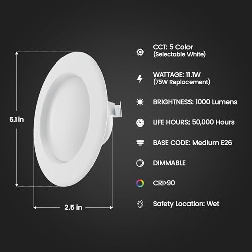 SUPERIOR BRIGHTNESS WITH ENERGY SAVINGS – Experience ultra-bright illumination with the Feit Electric Enhance 4-inch LED recessed downlight, delivering an impressive 1000 lumens of crisp, high-quality light while using only a fraction of the energy compared to traditional incandescent bulbs. This 75-watt equivalent LED light consumes significantly less power, helping reduce energy costs and making it an eco-friendly lighting choice for your home or office