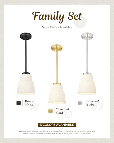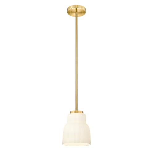 Modern Milk Glass Pendant Light – Brushed Gold Finish: This pendant light features a brushed gold finish and a striped opal glass shade, offering soft, diffused lighting that reduces glare. Its clean lines and warm glow create a modern, elegant look. Size: 6.3”L × 6.3”W × 51.8” Max Height