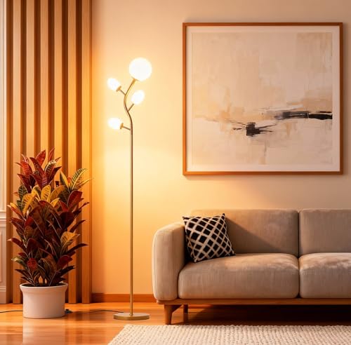 Ambient Lighting gold standing lamp: Frosted anti glare glass globe adding 4pcs 3000K led bulbs emitting soft warm light, bring a touch of sophistication to every corner of your home or workspace. creates a cozy atmosphere for living room, bedroom, kids room, girls room.