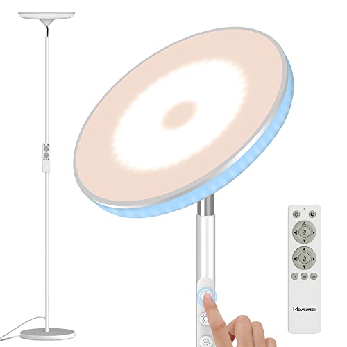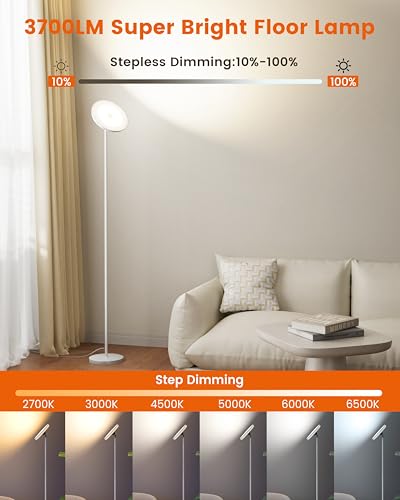 ?Superior Brightness?: The 42W main light delivers over 3700 lumens, from 2700k warm white to 6500k cool white, without glare or strobe effects. Our modern floor lamp illuminates living rooms, bedrooms, or offices brightly and evenly. Smooth or step dimmable from 10% to 100% brightness to meet all your lighting needs, whether for reading, writing, or work
