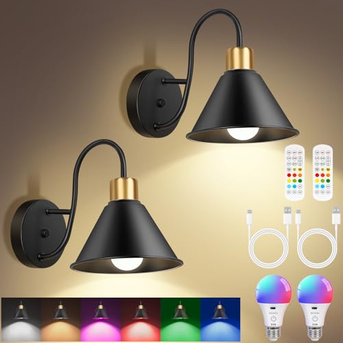 ?Wire-free Install?Add wireless wall lights without needing an electrician! No hardwired mounting.Just fix the base of the wall lamp with screws, no need to run wires through walls or plug in.the battery wall sconces set of two only takes a few minutes to install.This battery powered wall sconce set comes with 2 metal wall lamps, 2 rechargeable RGB LED bulbs, 2 remote controls, 2 USB charging cable (Type-C), mounting screws, 1 installation instructions.