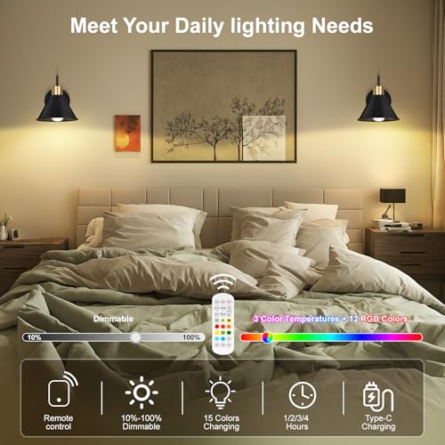 ?Up to 15 Colors Selectable & 10 Dimmable Brightness?The 3 daily color temperatures(2700K-6500K), plus 12 RGB colors options and 10 dimmable brightness feature, provide an entertaining and colorful lighting experience. The color changing battery wall sconce features flash and smooth modes,meet your need for study, rest, entertainment, or add ambiance.