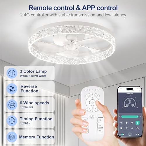 6 Wind Speeds & Timer Settings: The quiet ceiling fan offers 6 speed levels plus a 1/2/4/8-hour timer, giving you customized airflow for sleeping, studying, or family meals; perfect for children’s rooms, offices, or small dining areas with low ceilings