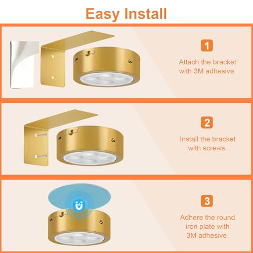 ?Easy to install?The light for pictures on wall are equipped with magnet sheets and have two mounting methods, Use 3M double-sided tape to install the bracket on the wall without the need for tools or wiring. We suggest installing the bracket on a rough wall with screws. We have equipped each lamp with an additional metal component that can be installed in the closet as a cabinet light. (Flexible disassembly for easy charging)