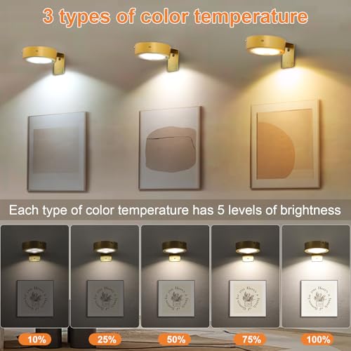 ?3 Color Temperature & Dimmable?Compact and bright, size information: diameter 85mm, thickness 30mm. The led picture lights for wall art have 3 color temperatures (warm white/Natural White/Cold white)5-level brightness adjustment, can adjust the brightness of the lights according to your own needs through the remote control.