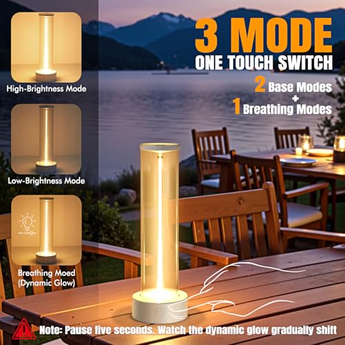 ?3-Mode Dimmable Touch Lamp?The touch table lamp has 2 basic modes + 1 breathing mode, namely high brightness, low brightness, and dynamic lighting (automatic gradient). ?Simply tap once? to cycle modes—whether you're reading, working, relaxing before bed, or enjoying a meal in the patio, a party in the gazebo, or camping in a tent, you'll find the perfect lighting for your needs