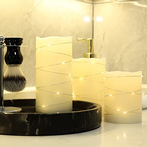 EMBEDDED STRING LIGHTS: Each candle is wrapped in silver wire string lights to provide small but bright points of light and a one-of-a-kind captivating look.