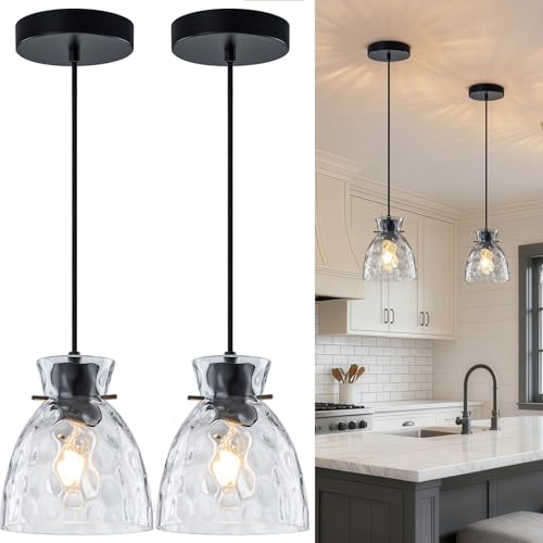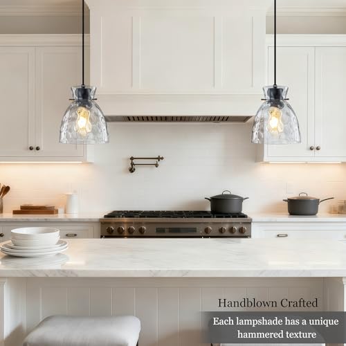 Hand-Blown Hammered Glass Pendant Light: Farmhouse black pendant lights kitchen island feature a special organic glass shape, each glass is carefully hand-blown by artisans, thicker on the market! Kitchen pendant lights with matte black finished blends modern and organic warmth, elevating any room
